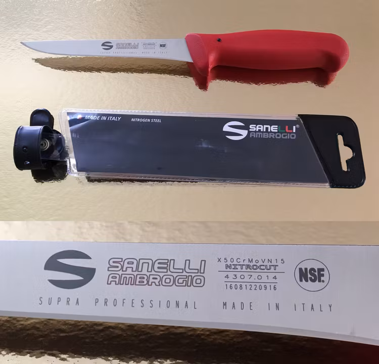 Bladlängd 14cm = 5½”Rött handtag i polypropen och termoplastgummiAlla material är steriliseringsbara och mycket resistenta mot slag, frätande ämnen och höga tem