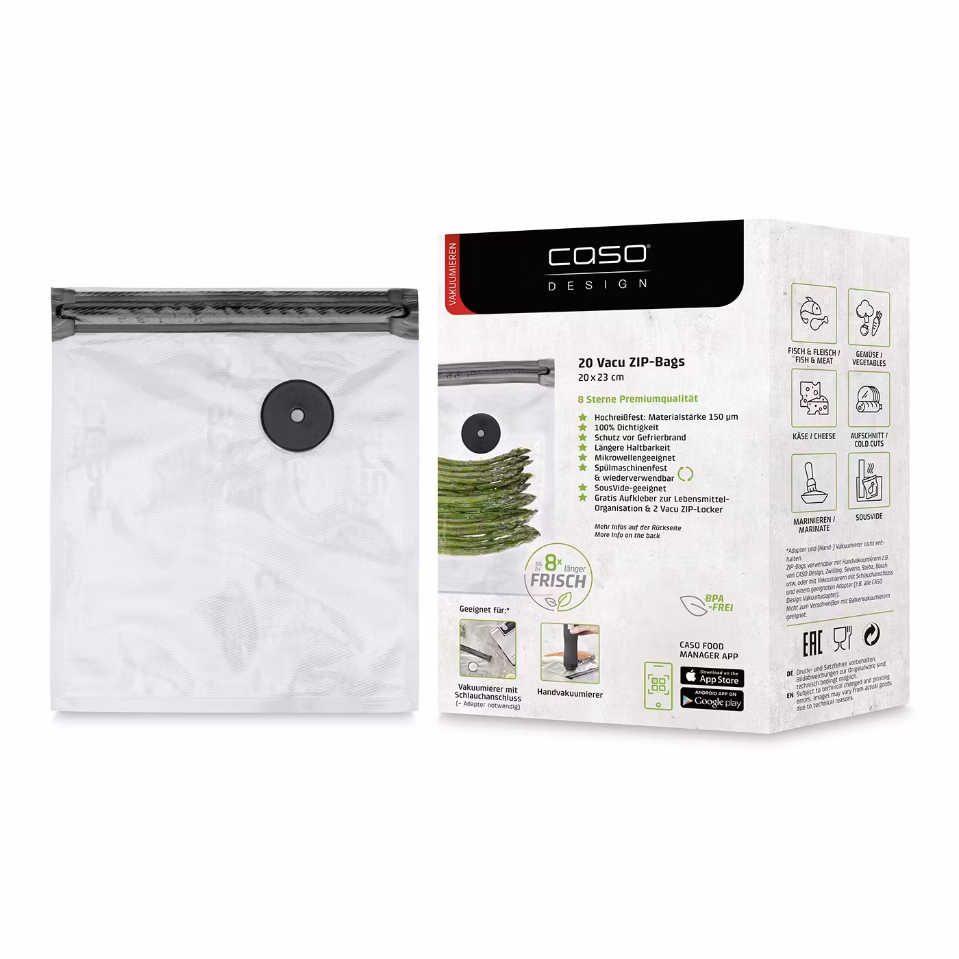 CASO Vacu ZIP-bagsVIDEOLÄNKMaterialtjocklek 150 μm: Särskilt stark och rivtålig - även med spetsiga föremål, såsom ben eller fiskbenStabil ribbstruktur för 100